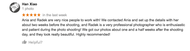 “Ania and Radek are very nice people to work with! We contacted Ania and set up the details with her about two weeks before the shooting, and Radek is a very professional photographer who is enthusiastic and patient during the photo shooting! We got our photos about one and a half weeks after the shooting day, and they look really beautiful. Highly recommended!!”