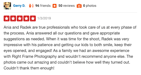 “Ania and Radek are true professionals who took care of us at every phase of the process. Ania answered all our questions and gave appropriate suggestions as needed. When it was time for the shoot, Radek was very impressive with his patience and getting our kids to both smile, keep their eyes opened, and engaged! As a family we had an awesome experience with Right Frame Photography and wouldn’t recommend anyone else. The photos came out amazing and couldn’t believe how well they turned out. Couldn’t thank them enough!”
