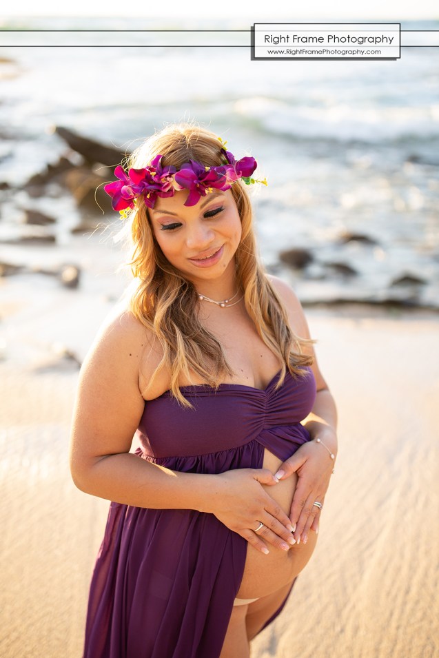 Hawaii Sunset Pregnancy Photoshoot at Secret Beach (near Four Seasons Resort Ko Olina Oahu Hawaii). Photographed by Hawaii Maternity Photographer – Right Frame Photography