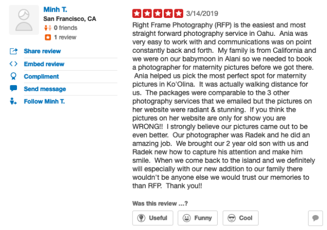 “Right Frame Photography (RFP) is the easiest and most straight forward photography service in Oahu. Ania was very easy to work with and communications was on point constantly back and forth. My family is from California and we were on our babymoon in Aulani so we needed to book a photographer for maternity pictures before we got there. Ania helped us pick the most perfect spot for maternity pictures in Ko’Olina. It was actually walking distance for us. The packages were comparable to the 3 other photography services that we emailed but the pictures on her website were radiant & stunning. If you think the pictures on her website are only for show you are WRONG!! I strongly believe our pictures came out to be even better. Our photographer was Radek and he did an amazing job. We brought our 2 year old son with us and Radek new how to capture his attention and make him smile. When we come back to the island and we definitely will especially with our new addition to our family there wouldn’t be anyone else we would trust our memories to than RFP. Thank you!!”