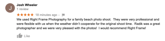 “We used Right Frame Photography for a family beach photo shoot in Hawaii. They were very professional and were flexible with us when the weather didn’t cooperate for the original shoot time. Radek was a great photographer and we were very pleased with the photos! I would recommend Right Frame!”