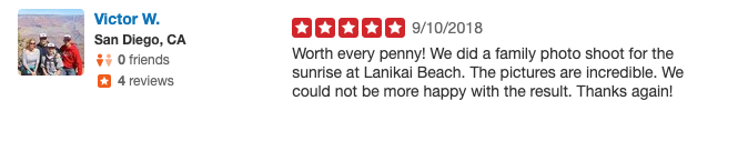 “Worth every penny! We did a family photo shoot for the sunrise at Lanikai Beach. The pictures are incredible. We could not be more happy with the result. Thanks again!”