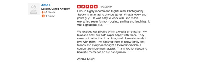 “I would highly recommend Right Frame Photography. Radek is an amazing photographer. What a lovely and polite guy! He was easy to work with, and made everything seem fun from posing, smiling and laughing. It was a great day out.
