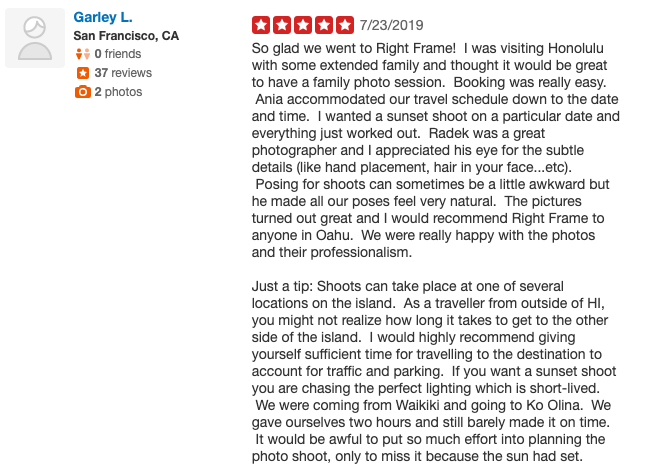 “So glad we went to Right Frame! I was visiting Honolulu with some extended family and thought it would be great to have a family photo session. Booking was really easy. Ania accommodated our travel schedule down to the date and time. I wanted a sunset shoot on a particular date and everything just worked out. Radek was a great photographer and I appreciated his eye for the subtle details (like hand placement, hair in your face…etc). Posing for shoots can sometimes be a little awkward but he made all our poses feel very natural. The pictures turned out great and I would recommend Right Frame to anyone in Oahu. We were really happy with the photos and their professionalism.