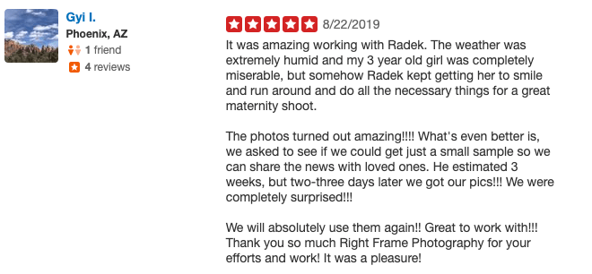“It was amazing working with Radek. The weather was extremely humid and my 3 year old girl was completely miserable, but somehow Radek kept getting her to smile and run around and do all the necessary things for a great maternity shoot.